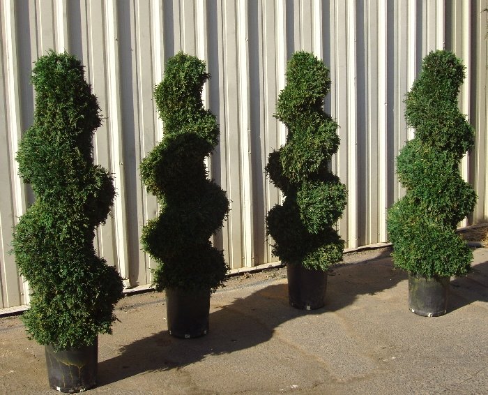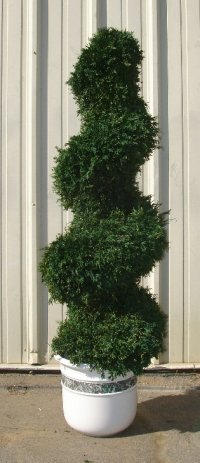Our hand-sculptered Spiral Junipers have solid, dense foliage, indicative of an authentic full-bodied sculptured spiral topiary as found in the world's most prized sculpted gardens. There is no exposed skeleton wood. Made from preserved Rocky Mountain Juniper. An excellent feature plant
